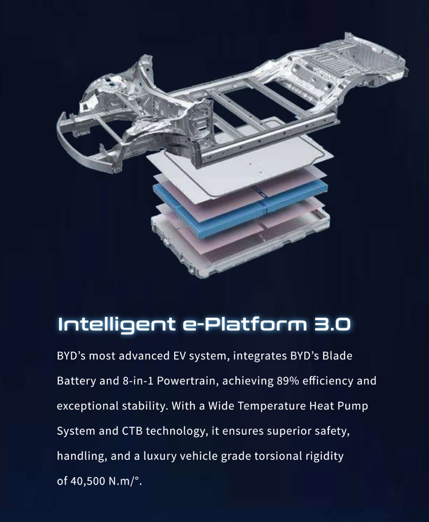 Sistem EV tercanggih BYD, mengintegrasikan Baterai Blade BYD dan Powertrain 8-in-1, mencapai efisiensi 89% dan stabilitas luar biasa. Dengan Sistem Pompa Panas Temperatur yang luas dan teknologi CTB, sistem ini memastikan keselamatan, penanganan, dan kekakuan torsi tingkat kendaraan mewah yang unggul sebesar 40.500 N.m/.